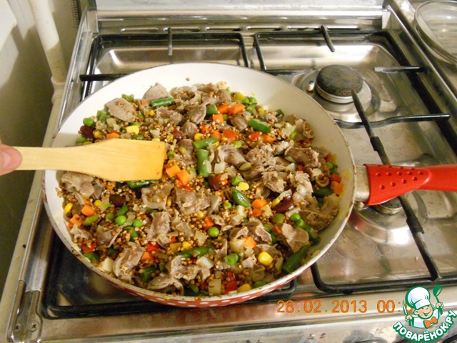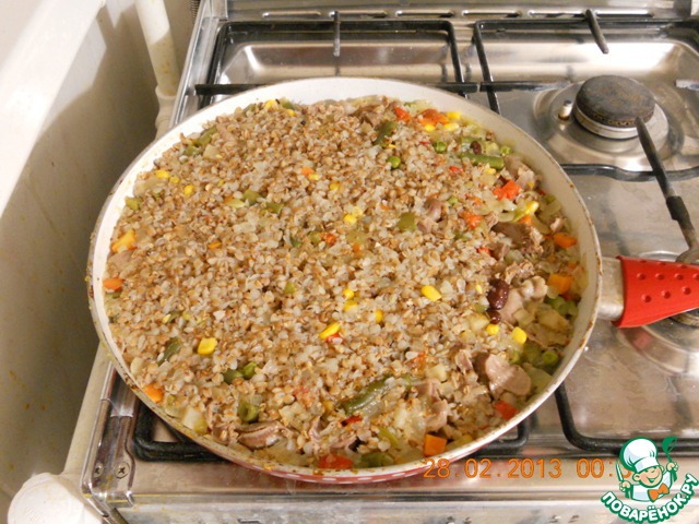 Промыть 1,5 ст гречневой крупы, посолить, добавить специи, перемешать.