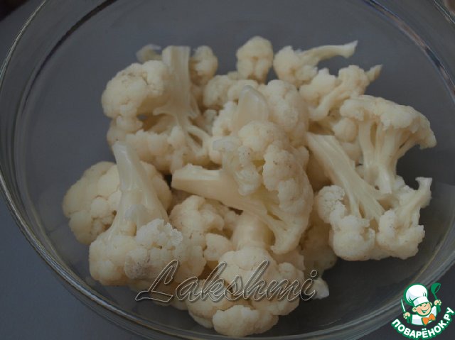 Цветную капусту сполоснуть и разобрать на небольшие соцветия, залить водой, довести до кипения, добавить в воду соль и варить 5 мин. Откинуть капусту на дуршлаг и дать стечь воде.
