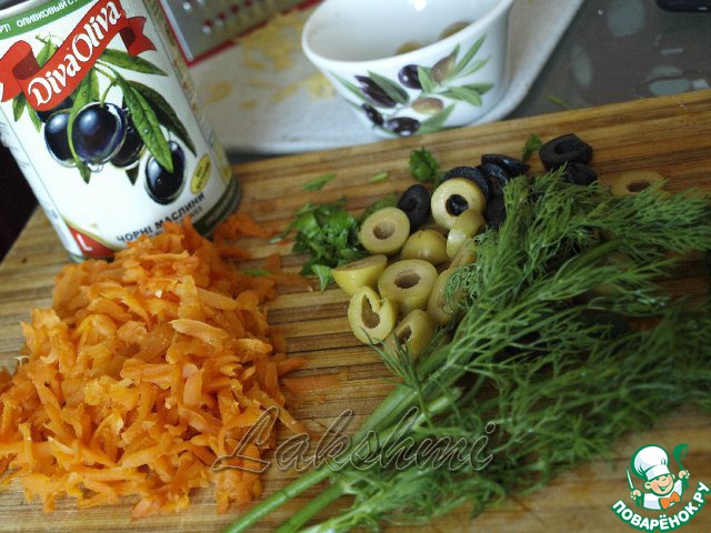 Морковь сварить и натереть на тёрке, нарезать кружочками оливки и маслины. Нарезать укроп.