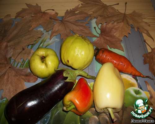 Баклажаны режем кубиками, перец соломкой, айву мелкими дольками, морковь кружочками. Посыпаем овощной приправой, черным перцем и немного солим.