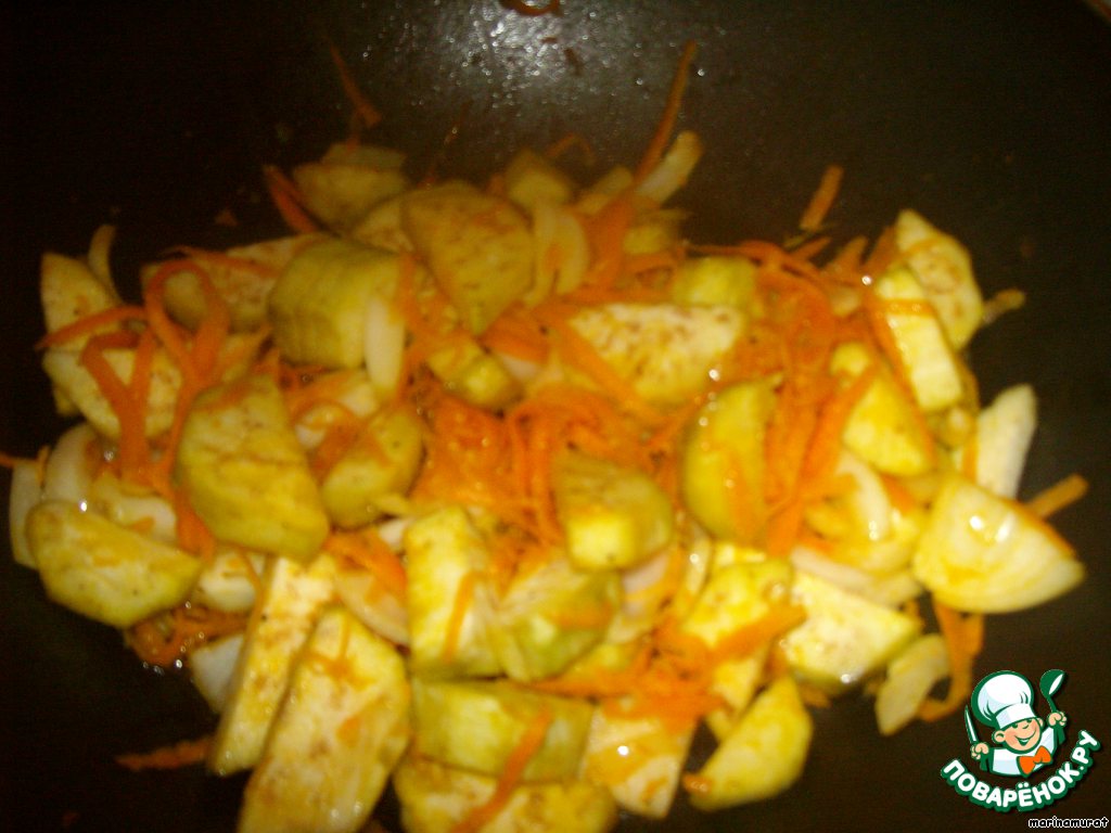 Вообще, овощи любые желательно не пережаривать! Поэтому через 2 минутки добавляем к нашим овощам помидор или пасту, перемешиваем и добавляем чесночок. Его лучше добавлять в самом конце, потому что с чесноком все обжаривать не рекомендуется, так как уйдут все ароматы, и вкуса, как такового чесночного, не будет.