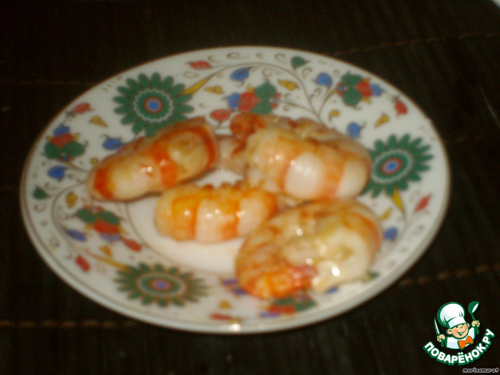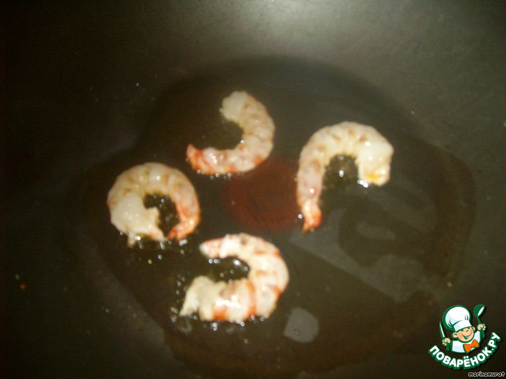 Пока икра охлаждается, мы будем жарить креветки. Полторы минуты и они готовы!!!