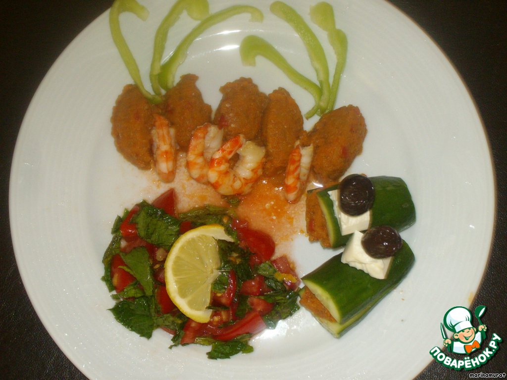 Креветки с баклажановой икрой и салатом из помидоров и мяты