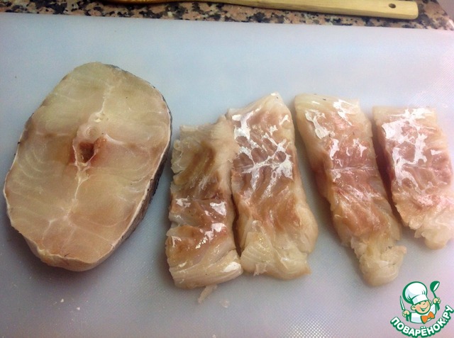 Разделать треску, отделив от костей и от кожи. Треска очень легко разделяется на филе, в этой рыбе кости только хребетные.