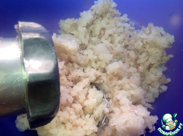Рыбный фарш смешать с рисом, мелко нарубленной зеленью и 2 яйцами. Соль и перец по-вкусу.