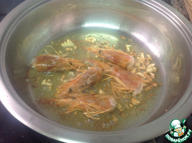 2 зубчика чеснока обжарить на оливковом масле, добавить креветочные головы, нажимая периодически, чтобы вышел весь сок, подсыпать 1 столовую ложку муки.