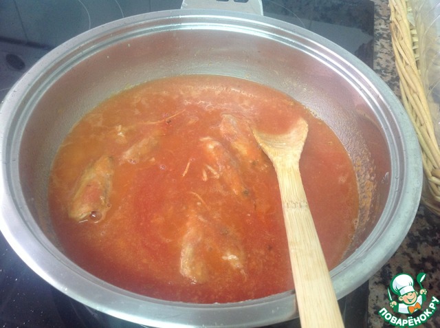 Подлить пассерованный томат, добавить щепотку соли и щепотку сахара и варить под крышкой 10 минут