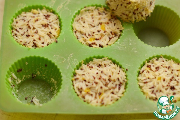 Выложить рис в силиконовые формы и отправить в разогретую до 180С духовку га 10-15 минут.