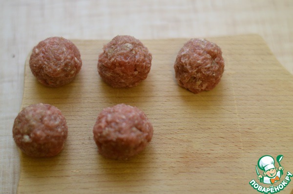 Из фарша, у меня телятина с луком, солью и смесью перцев, сформировать шарики. В сковороде разогреть масло и обжарить их со всех сторон до готовности.