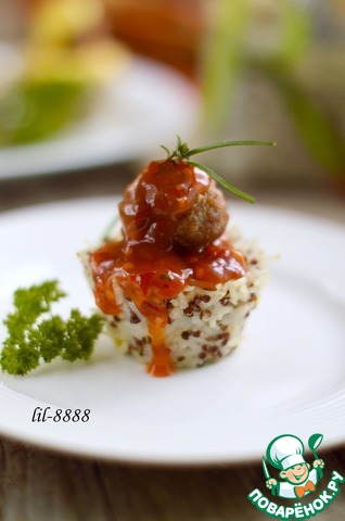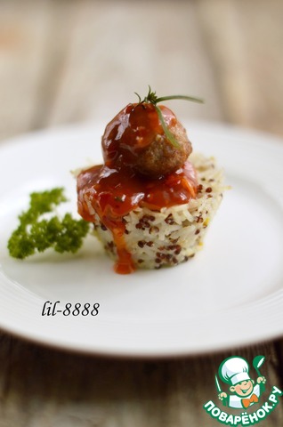 Форму вынуть из духовки, слегка остудить и вынуть рисовые запеканки. На каждую положить по мясному шарику, полить соусом и украсить зеленью.