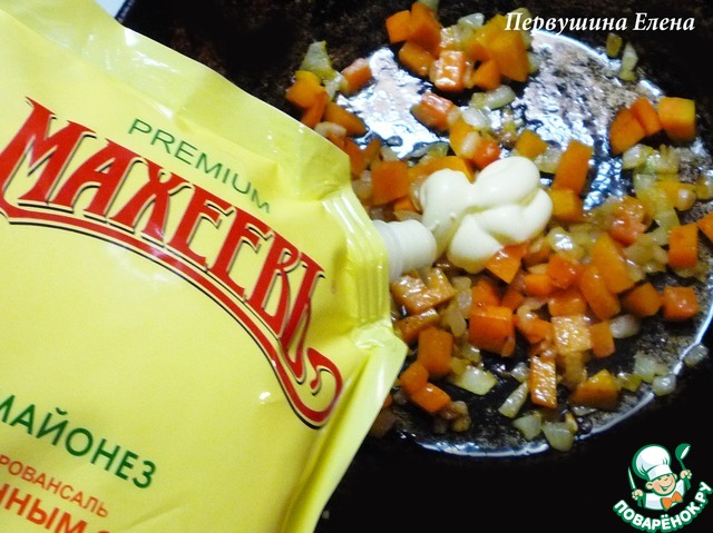 Добавить майонез и немного воды (бульона) и потушить до мягкости.