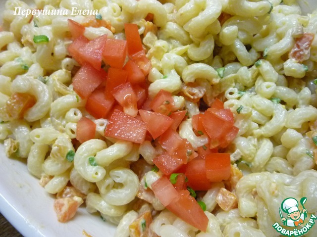 нарезать кубиками помидор. Размешать, чтобы распределить соус равномерно по всем макаронам.