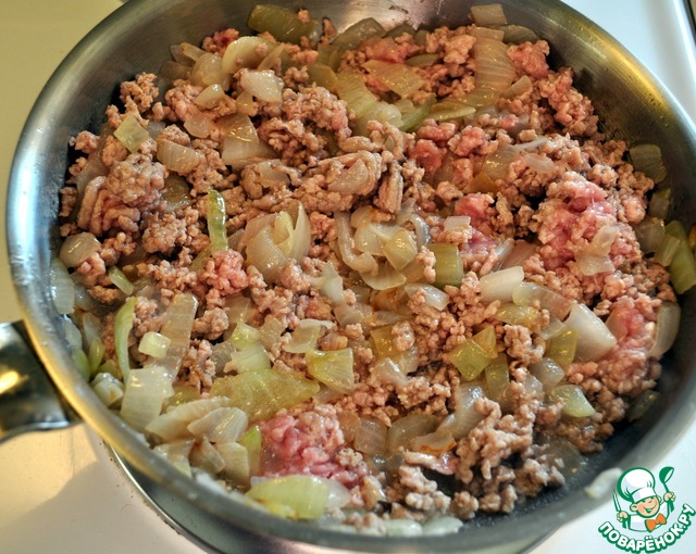 Выложить фарш на сухари и залить сырно-молочной смесью. Сверху положить капусту. Запекать 20 минут.