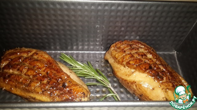 Главное утиную грудку не пережарить и не пересушить. Разогреваем духовку на 200 градусов и ставим на сильный огонь сковородку. Грудку достать из маринада и быстро обжарить на сковороде со всех сторон. Выложить на тарелку и натереть медом. Сложить в форму для запекания, добавить веточку свежего розмарина и отправить в духовку на 12-15 минут, в зависимости от желаемой степени прожарки. Я держала мужу 12 минут и она была розовая и очень сочная, а себе 14 минут, так как я люблю немного по суше. Извлекаем из духовки, подаем с соусом http://www.povarenok.ru/recipes/show/85361/ - мой соус. Гарнир или его отсутствие- на ваше усмотрение. Я подавала с рисом "Басмати" и шпинатом.