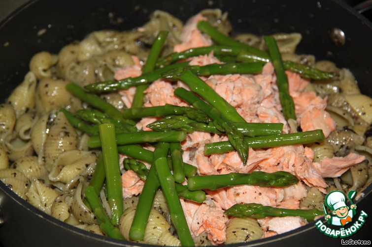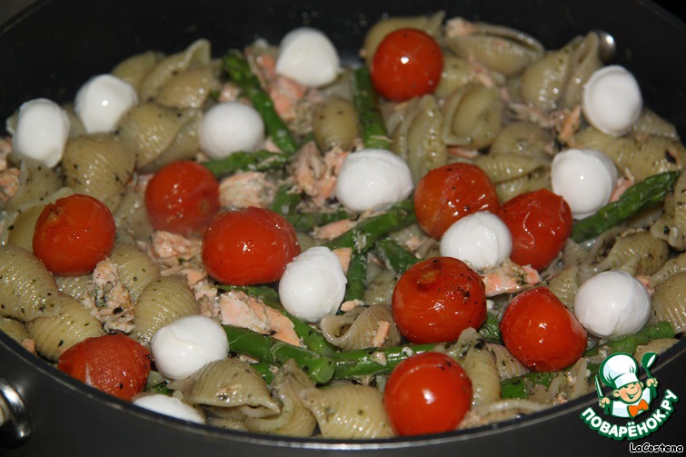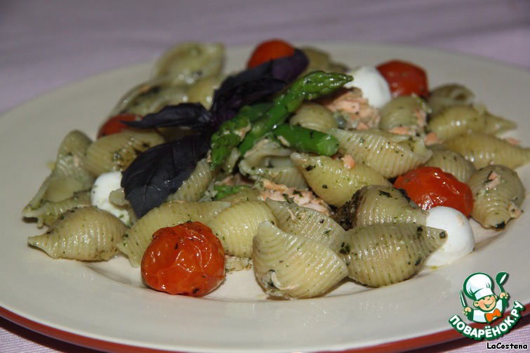 | Назвала это блюдо "Морским" из-за лосося и макарон-ракушек, которые являются основной его составляющей. А томаты, спаржа, моцарелла и соус песто так тонко создают аромат морского воздуха... Эх... хочу лето!)))) |