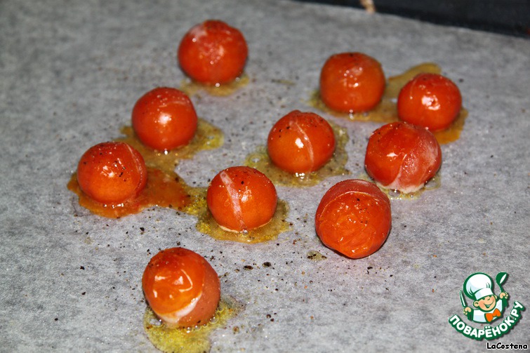 Томаты черри посолить, поперчить, сбрызнуть оливковым маслом и отправить в разогретую до 200 градусов духовку на 5-7 минут.