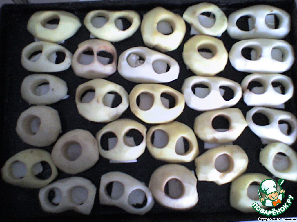 Очищенную картошку разрезаем пополам и вырезаем отверстия (я для этого приспособил обыкновенную трубку для начинки колбас, шедшую в комплекте с мясорубкой).