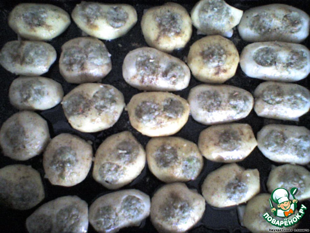 Начиняем картошку приготовленым фаршем, обильно смазываем растительным маслом и только после этого посыпаем приправой (поаккуратней с солью, в готовых приправах она уже присутствует).