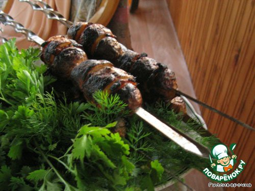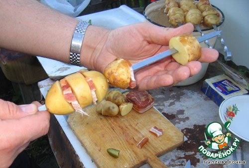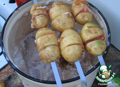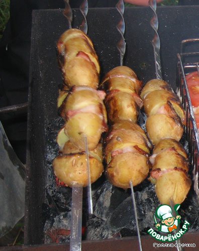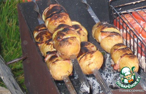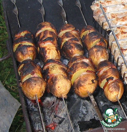 Картофель помыть, разрезать на 3 части поперек, нанизать на шампур, чередуя с кусочками грудинки.