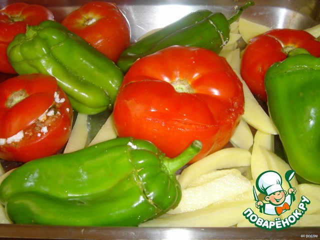 Начините овощи, не до конца и не утрамбовывая, положите поверх фарша фету, закройте шляпкой. Выложите овощи в форму близко друг к дружке. Полейте оливковым маслом, добавьте чуть водички. Можете добавить картофель.