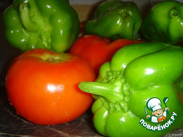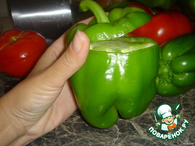 С каждого надрезать шляпку. Аккуратно из перцев достать семена, а с помидоров чайной ложечкой достать мякоть, не выбрасывать. Внутренность каждого овоща чуть присолить.