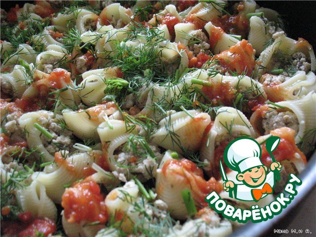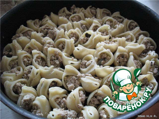 Берем ракушку, кладем в нее соразмерный кусочек начинки и укладываем в посуду, предназначенную для духовки.