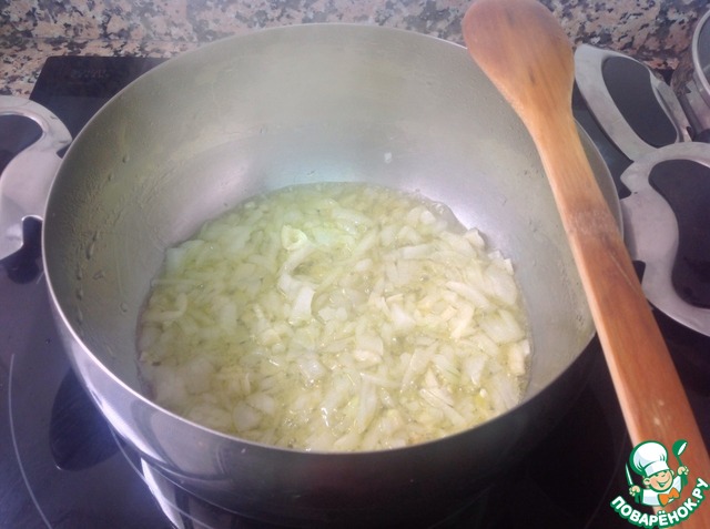 Луковицу и чеснок мелко нашинковать и обжарить на оливковом масле до золотистого цвета