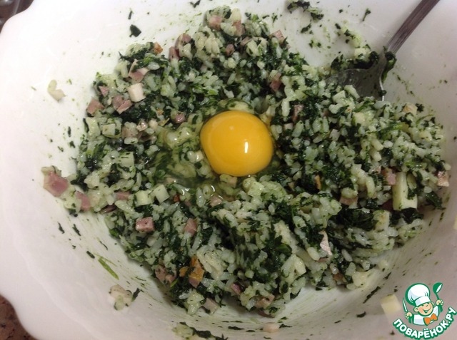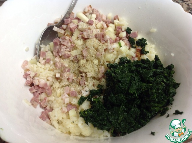 Теперь, когда все ингредиенты готовы, смешаем рис, шпинат, сыр и окорок