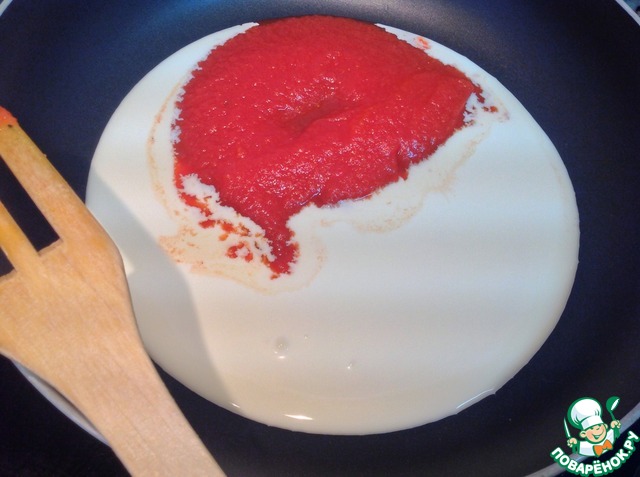 Для соуса: смешаем на сковороде томат и сливки, добавим щепотку мускатного ореха. Соль и перец по-вкусу