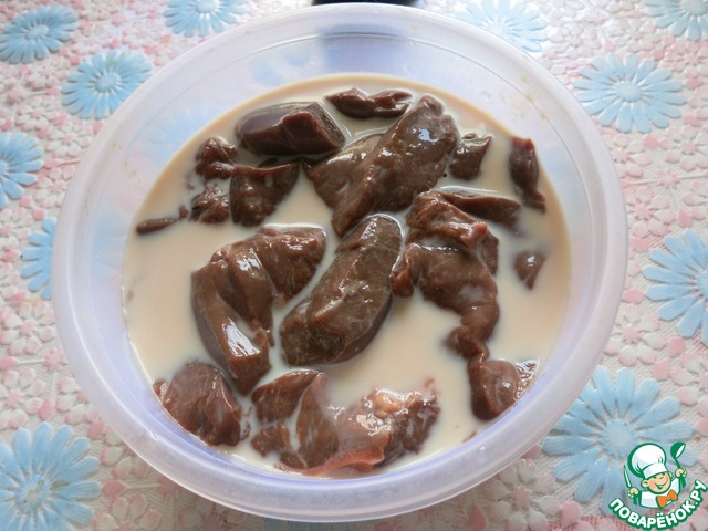 Печень очистить от пленок, нарезать кусочами примерно 3*3 см и залить молоком (лучше на ночь)