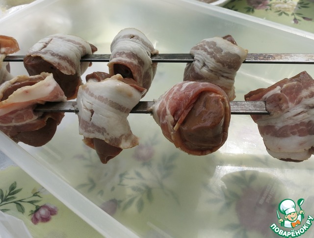 Каждый кусочек оборачиваем в полоску бекона и нанизываем на шампур.
