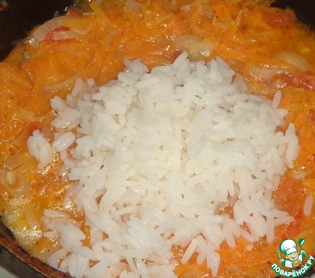 Добавляем сметану, соль, черный молотый перец. Чеснок порезать небольшими кусочками и добавить к овощам. Тушим овощи под закрытой крышкой около 15 минут на медленном огне. Если потребуется, то подливаем воду. Добавляем отварной рис и перемешиваем. Тушим 2-3 минуты.