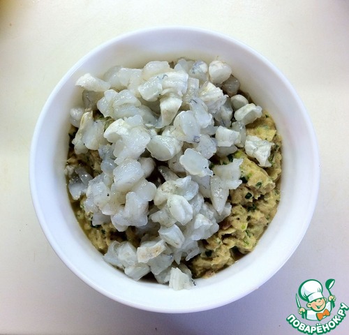 Очищенные креветки нарезать и добавить в рыбный фарш.