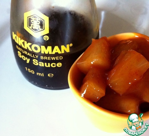 В небольшой сотейник влить соевый соус, соус чили, рисовый уксус, томатную пасту. Добавить крахмал, размешать, чтобы не было комочков. Затем выложить в эту массу кусочки ананасов вместе с жидкостью из банки. Держать на небольшом огне до загустения.