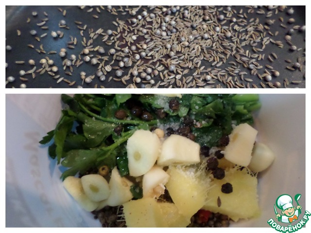 Первым делом на сухой сковородке поджарим семена тмина и кориандра. Это нужно для усиления вкуса и полного раскрытия аромата. Занимает около 2 – 3 минут. Затем смешиваем все составляющие, кроме мяса, конечно, и пробиваем блендером. Должна получиться густоватая, очень ароматная кашица.