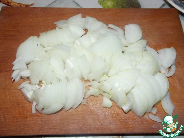 Затем в сковороду кладем сливочное масло как оно растопилось кладем лук и обжариваем его минуты 2..