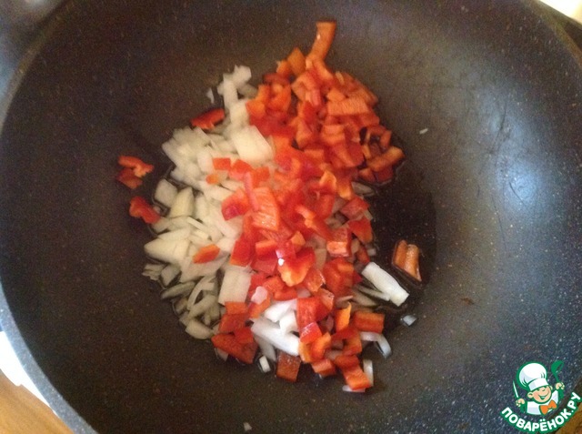 Режем лук белый и болгарский перец. В сковороде нагреваем масло и обжариваем лук с перцем.