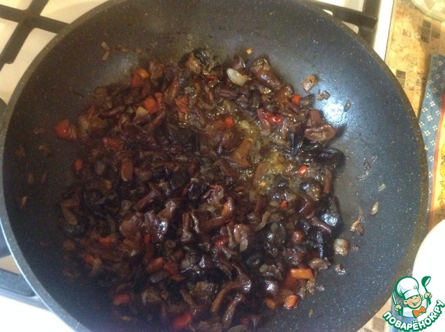 Пока жарятся грибы, режем мясо на кусочки, добавляем в сковородку и обжариваем до золотистой корочки. Солим, добавляем специи.
