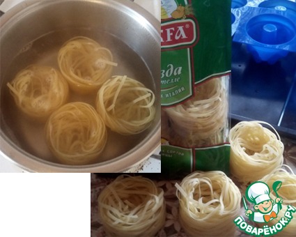 Выкладываем в несильно кипящую воду гнезда в один ряд, не закидывайте все сразу. При варке они разварятся и смешаются, а нам этого не надо! Гнезда варим 3 минуты (не обращайте внимание на время, указанное на пачке, т. к. наши гнезда еще будут доходить в духовке)