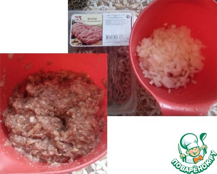 Готовим фарш: нарезаем мелко-мелко лук, добавляем к нему фарш, наливаем немного воды кипяченой, солим, перчим, добавляем специи. Хорошо вымешиваем. Водичка сделает наш фарш воздушным и сочным.