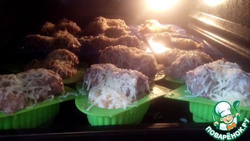 Натираем мелко сыр, формируем мини-тефтели и выкладываем их поверх гнезд, добавляем сливки, посыпаем сверху тертым сыром. Ставим в духовку на 30-40 минут при температуре 170 С.