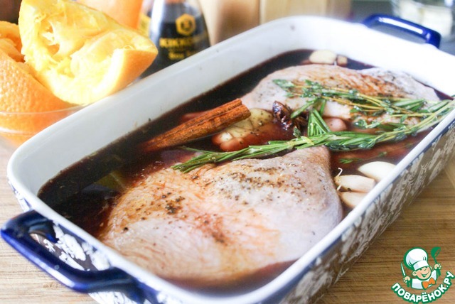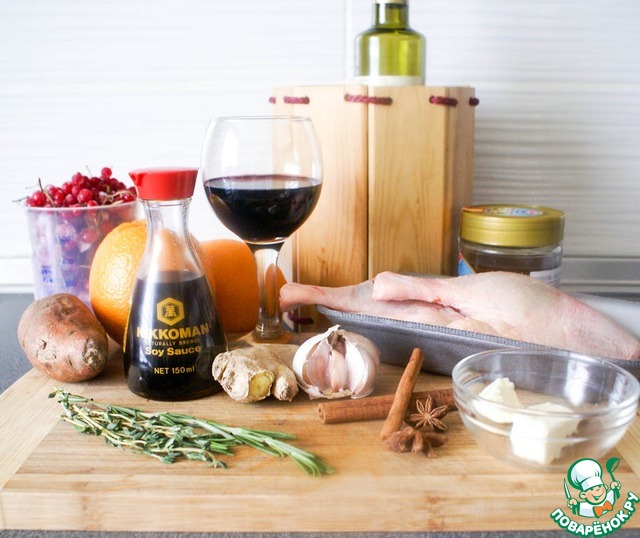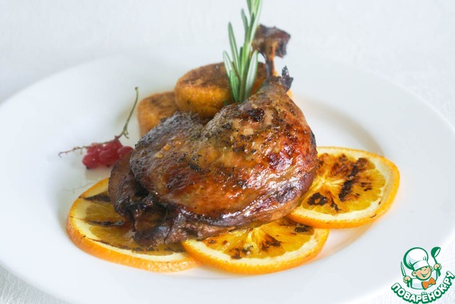 | Утиная ножка, томленая в соусе-маринаде из красного вина, апельсинового сока и соевого соуса с ароматными специями и травами, с пряной ароматной подливой на основе указанного маринада с нотками красной смородины. Вкусное и красивое блюдо для уютного домашнего ужина или праздничного приема гостей. |