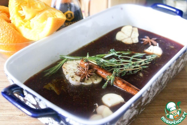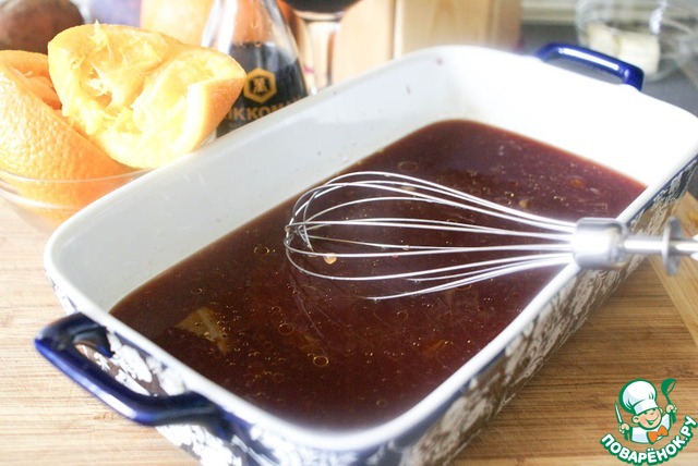 Для маринада смешать в жаропрочной форме вино, соевый соус, оливковое масло и сок одного апельсина. Ввести мед и хорошо распустить его в жидкости, чтобы он не оседал на дно.
