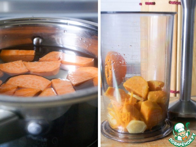 *В этот раз я делаю крокеты из сладкого картофеля - батата. Очищенный батат отварить около 10 минут после закипания до мягкости. Пюрировать вместе с цедрой апельсина и кусочком имбиря (1см). Заправить солью и перцем по вкусу.