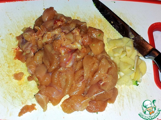 Налила соус в сковороду с овощами и курицей, добавила воду. Тушила минут 5 - 7, затем закрыла крышкой сковороду и выключила плиту. Оставила на 5 минут тушиться.