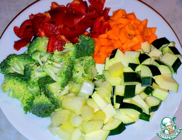 Овощи я взяла пяти цветов, нарезала их кубиками - брокколи, перец, морковь, цуккини, репчатый лук.