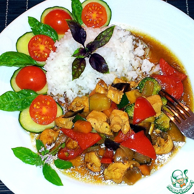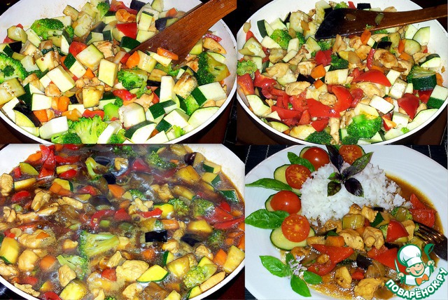 | Я часто готовлю блюда из овощей, в основном на ужин. Взяла овощи пяти цветов и добавила к ним филе курицы. Мои мужчины овощи без мяса и гарнира не очень хотят есть, поэтому для них я приготовила с курицей и пропаренным рисом. |