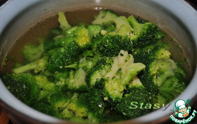 Брокколи разделить на небольшие соцветия и отварить 3-5 минут в подсоленной воде, откинуть на дуршлаг.