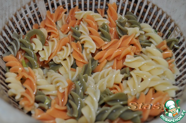 В этой же воде отварить макароны, тоже выложить в дуршлаг, промыть холодной водой.