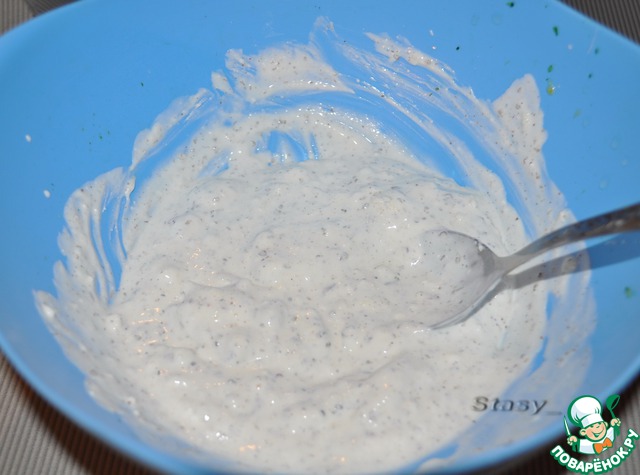 В творог выдавить зубчик чеснока, добавить специи: соль, перец, прованские травы: (главное – тимьян), всё хорошенько перемешать. Если творог суховат, можно добавить немного сметанки.